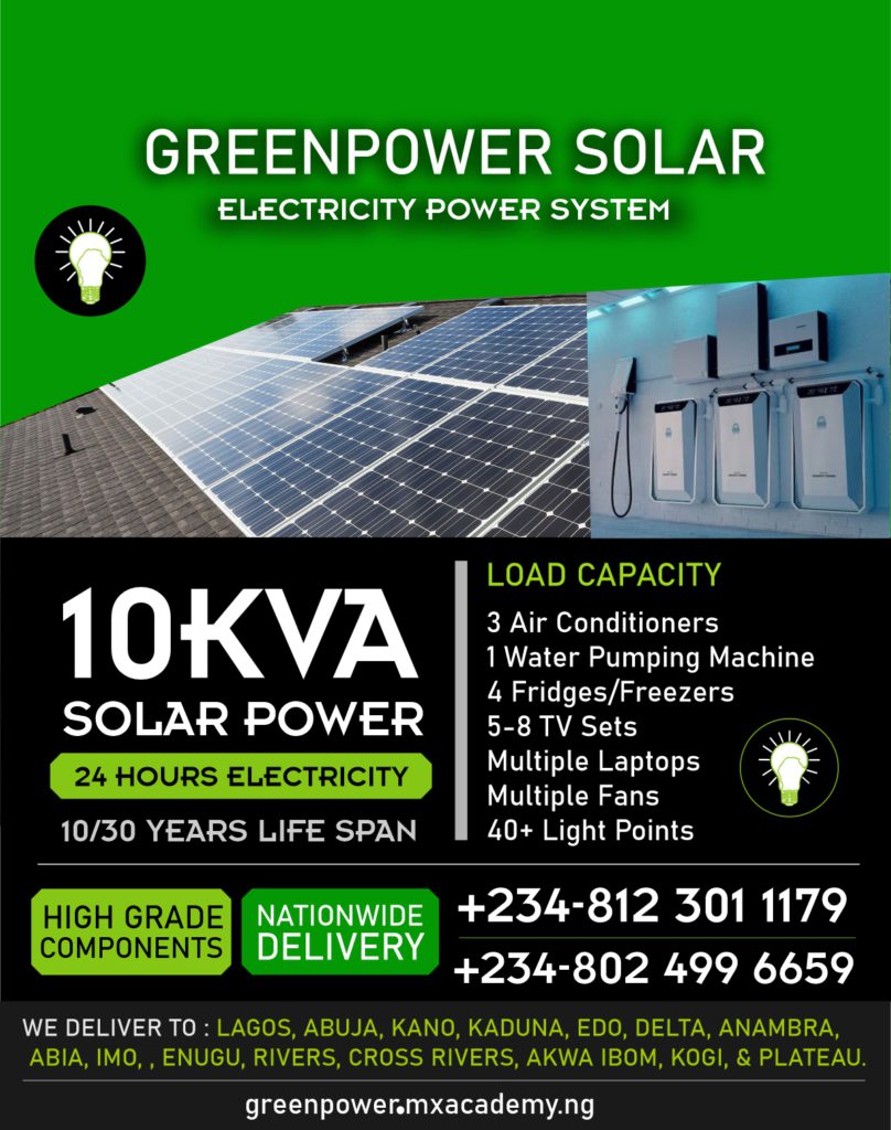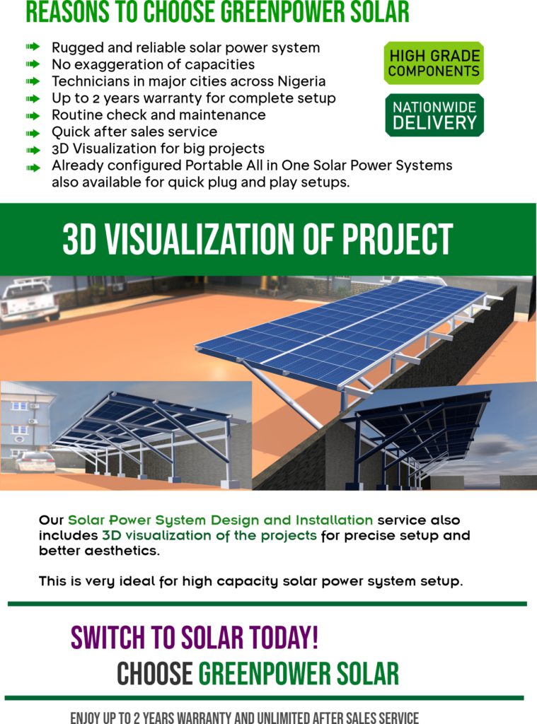 Enjoy constant electricity daily with Greenpower Solar Electricity Power Systems. No fuel, No diezel, No noise!. Our products are very reliable and comes with 2 years warranty. Available in different capacities.